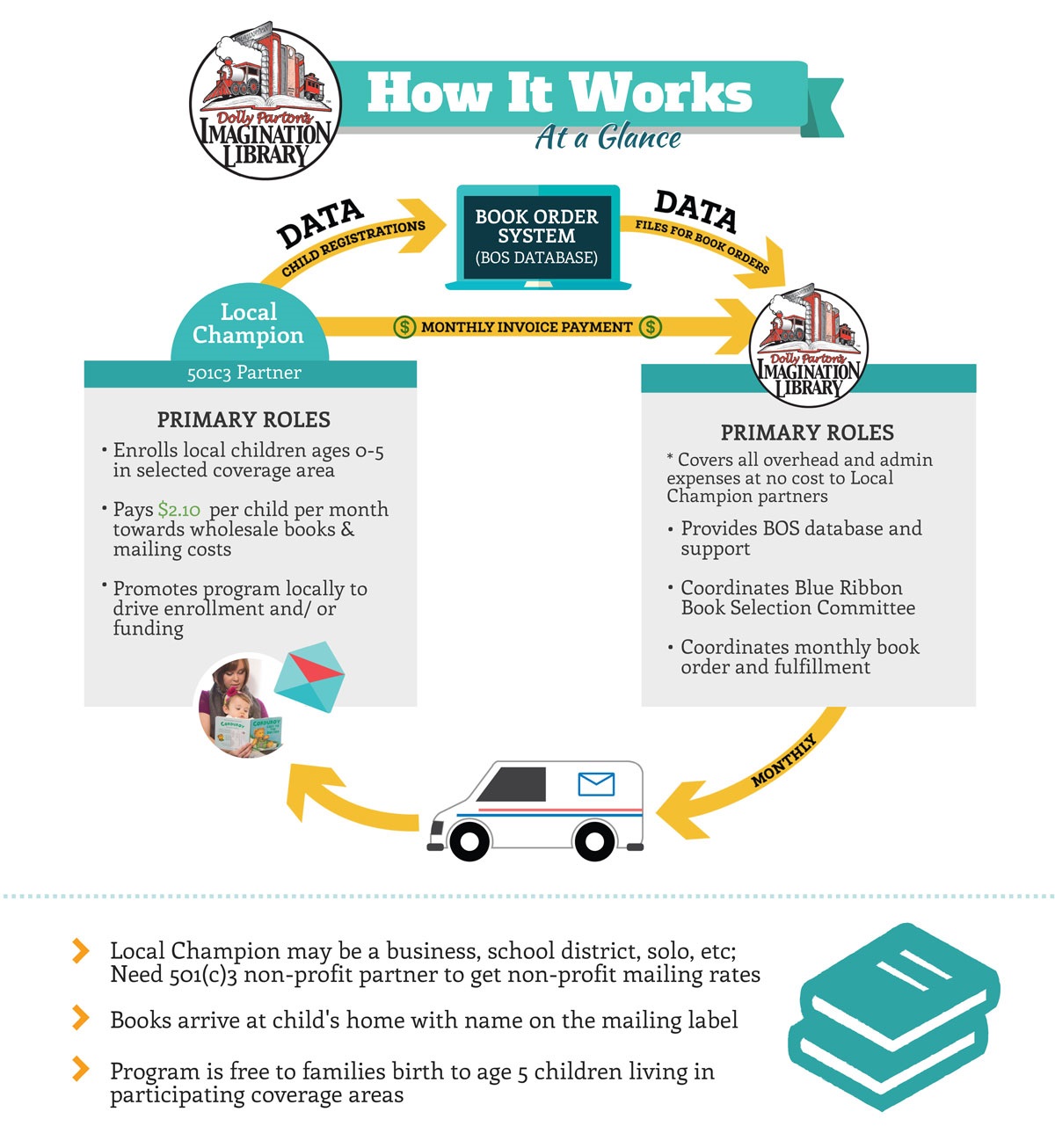 Dolly Parton's Imagination Library puts books into the hands and hearts of children across the world. They partner with local communities to provide one free, high-quality book each month to our children from birth to age five. These books are selected by early childhood experts to be age-appropriate, personalized with the child's name and mailed directly to the child's home. This creates a gifting experience that makes books exciting and encourages families to spend time enjoying books together.